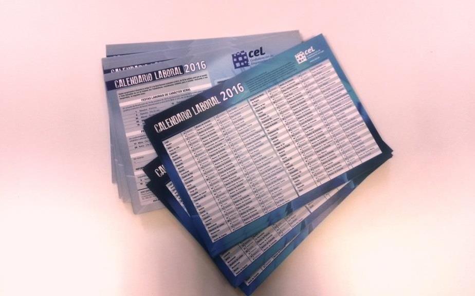 En la sección de documentación de esta web está disponible para descarga el modelo de Calendario Laboral 2016 en pdf, que confeccionamos desde la CEL todos los años para facilitar su exposición en los centros de trabajo, en cumplimiento de lo establecido en la Ley del Estatuto de Trabajadores (el Art. 34.6 dispone expresamente la obligatoriedad de exposición en un lugar visible para empresas con trabajadores).