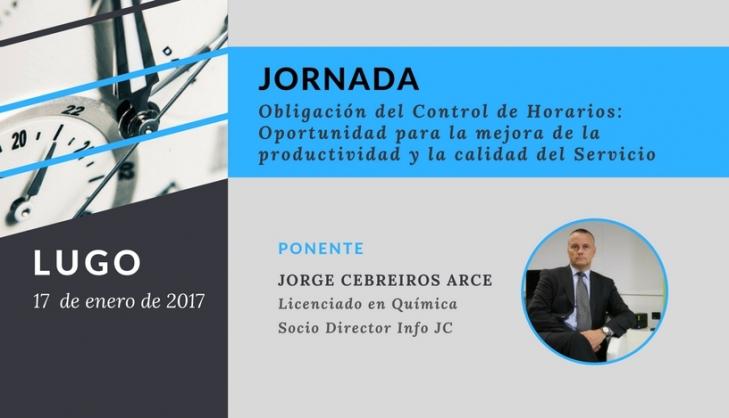 Con la finalidad de analizar los detalles legislativos de la obligación de las empresas de registrar su actividad y controlar los horarios de sus empleados, las sanciones que supone, y como facilitar el cumpliento de esta obligación y convertirlo en una oportunidad, la Confederación de Empresarios de Lugo organiza, para el próximo martes día 17 de enero de 2017, en horario de 12:00 a 13:30 horas, una jornada informativa dirigida a directivos y empresarios interesados en la materia y en nuevas herramientas para su gestión, en la que se contará con las aportaciones como ponente de Jorge Cebreiros Arce, Licenciado en Química y Socio - Director de InfoJC, empresa especializada en gestión de control de horarios (al final de esta entrada puede descargarse programa completo en pdf).