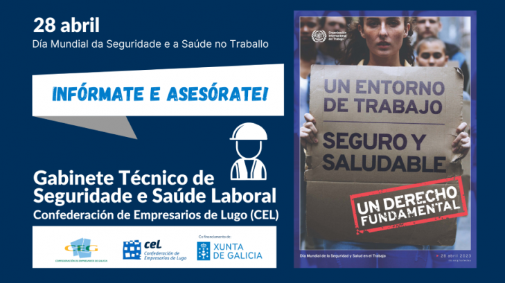 Por outra banda, e coincidindo tamén co Día Mundial da Seguridade e Saúde Laboral 2023, desde a CEL organizamos a xornada informativa "Contorna de traballo seguro e saudable como dereito fundamental", que terá lugar a partir das 10:00 horas en formato presencial (na sede central da CEL) e online. O acceso é gratuíto e a inscrición continúa aberta.