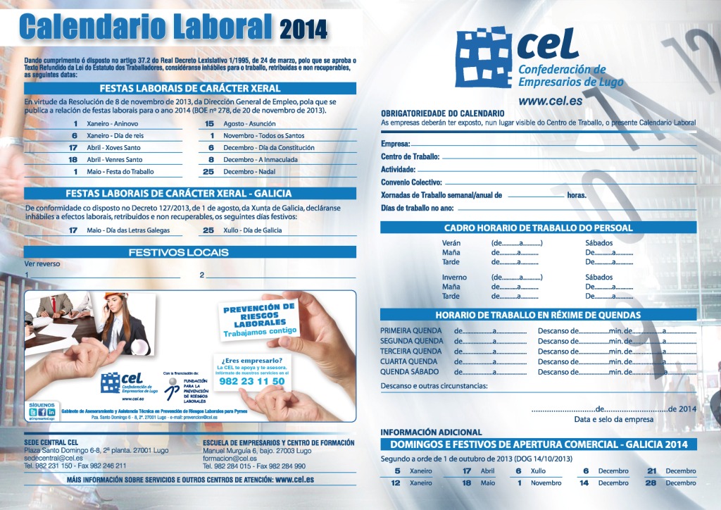 El modelo de Calendario Laboral de la CEL contiene información de los festivos nacionales (Resolución, de 8 de noviembre, de la Dirección General de Empleo), autonómicos (Decreto 127/2013, de 1 de agosto, de la Xunta de Galicia), y de los provinciales (Resolución de la Xefatura Territorial de la Consellería de Traballo e Benestar - BOP de 22 de octubre de 2013), así como otros datos adicionales de interés como los domingos y festivos de apertura comercial.