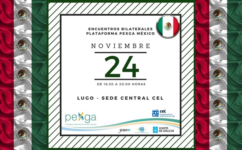 La sede central de la Confederación de Empresarios de Lugo (CEL), recibe el próximo día 24 de noviembre, jueves, a la directora de la Plataforma Pexga en México, Adriana Cao García, con la que las empresas lucenses interesadas podrán mantener encuentros individuales, en horario de 16:30 a 20:00 horas, para efectuar consultas específicas sobre el mercado mexicano.