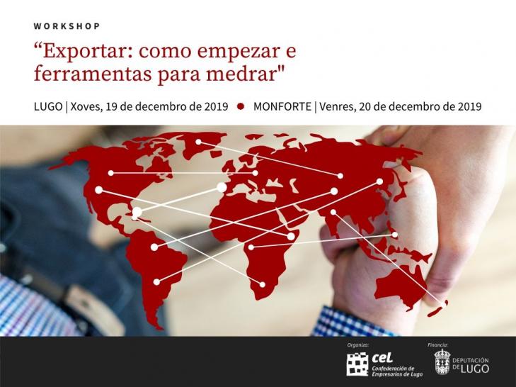 Estos workshops tienen por objetivo proporcionar información útil a las empresas de la provincia de Lugo con interés en exportar o incrementar sus posibilidades en el exterior y tendrán lugar los próximos días 19 de diciembre, jueves, en Lugo y el viernes 20 en Monforte de Lemos, en horario de 9:30 a 14:00 horas.