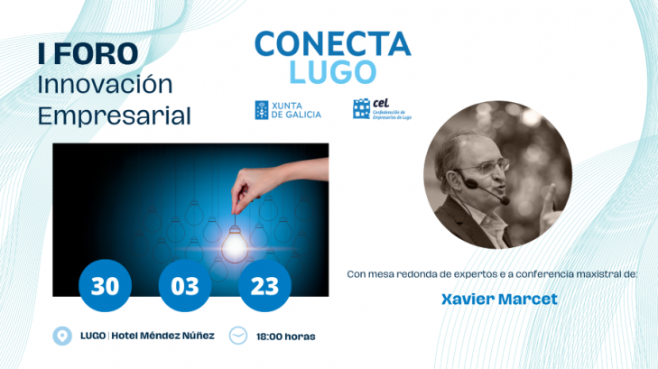 Este foro, concebido como un evento de impulso de la cultura innovadora en Lugo, contará con la conferencia magistral de Xavier Marcet, consultor en estrategia, innovación y emprendimiendo corporativo formado en postgrado en las escuelas de negocios UC Berkeley IESE y ESADE y una licenciatura anterior en historia por la UAB. Xavier Marcet es además Presidente de Lead To Change LTCproject, empresas en red dedicadas a la consultoría en estrategia e innovación, y 8 Wires, una startup sobre Big Data y Management.