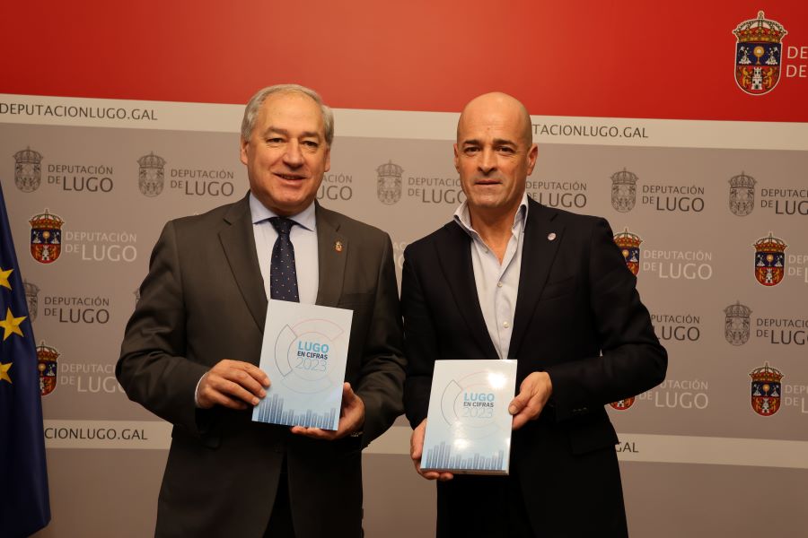 El Presidente de la Diputación de Lugo, José Tomé Roca, y el secretario general de la Confederación de Empresarios de Lugo (CEL), Jaime López Vázquez, presentaron este jueves en el Pazo de San Marcos la publicación Lugo en Cifras 2023, un estudio elaborado por cuarto año consecutivo por la organización empresarial gracias a la colaboración de la institución provincial, y que recopila los datos demográficos, sociolaborales y económicos más significativos de la provincia y de los 67 municipios que la conforman.