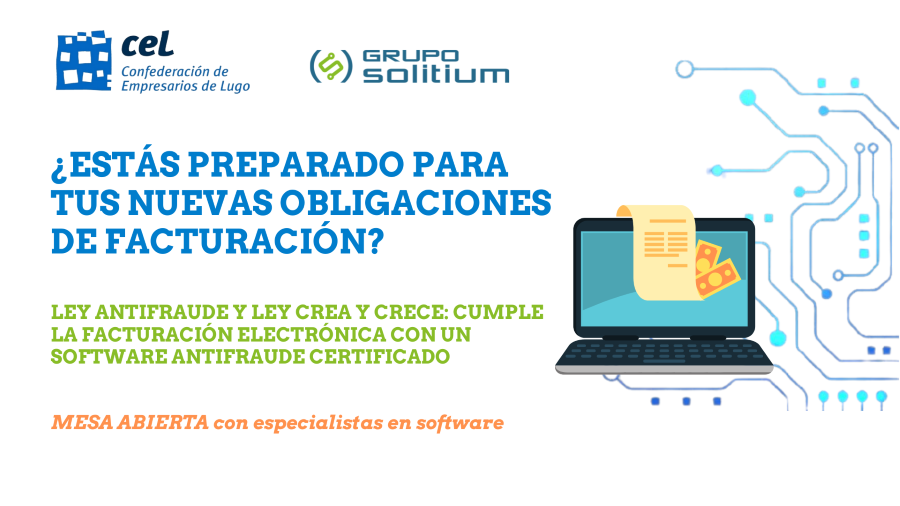 La sede central de la Confederación de Empresarios de Lugo (CEL) acogerá el próximo día 12 de marzo de 2024, martes, a las 12:00 horas, una jornada informativa con el Grupo Solitium acerca de la implantación de software certificado para la Ley Antifraude y la Ley Crea y Crece.