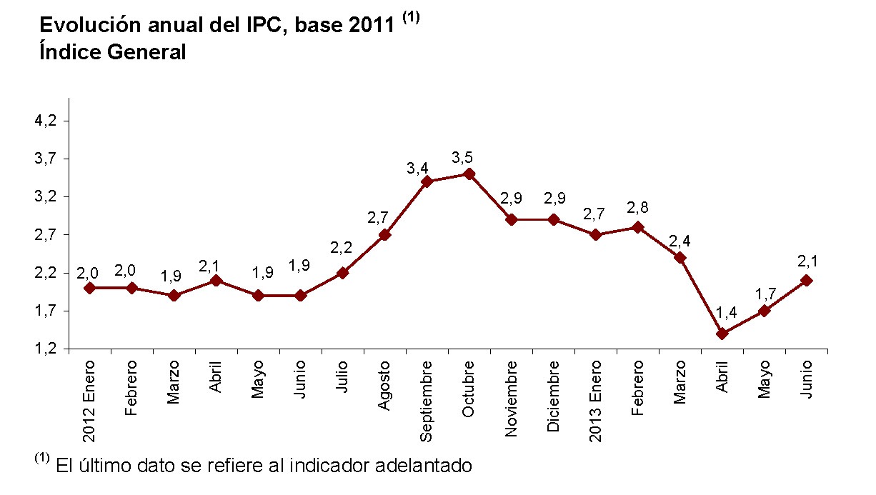O Instituto Nacional de Estatística (INE) deu a coñecer hoxe os datos adiantados da inflación anual estimada, segundo os cales o IPC en xuño de 2013 sitúase no 2,1%.