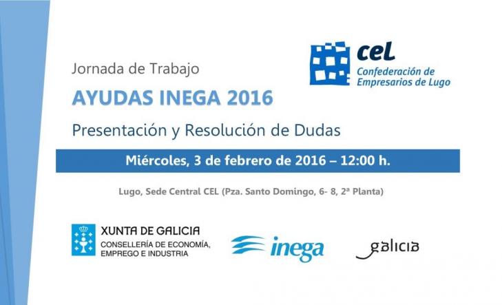 A Confederación de Empresarios de Lugo (CEL) organiza a Xornada de Traballo "Axudas do INEGA 2016 para Aforro e Eficiencia Enerxética", en colaboración coa Consellería de Economía, Emprego e Industria e o Instituto de Eficiencia Enerxética (Inega).