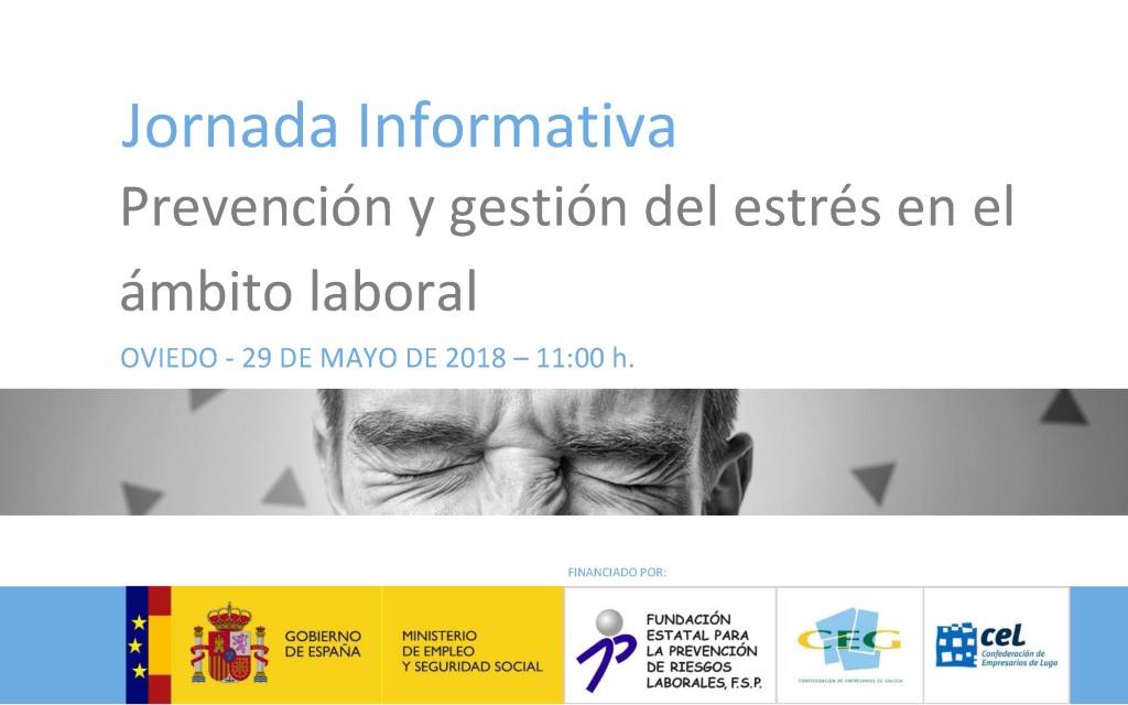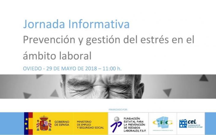 A Confederación de Empresarios de Lugo organiza, co financiamento da Fundación Estatal para a Prevención de Riscos Laborais F.S.P e a colaboración da Federación Asturiana de Empresarios (FADE), esta xornada informativa na que se analizará desde o concepto da estrés laboral, detallaranse medidas preventivas e correctoras ou se presentarán novas ferramentas de xestión.