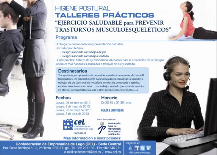 Co obxectivo de promover hábitos saudables de hixiene postural na contorna laboral, así como a práctica periódica de exercicio físico para previr trastornos músculoesqueléticos, contrarrestando os riscos propios de cada posto de traballo, a Confederación de Empresarios de Lugo (CEL) organiza, co financiamento da Fundación para a Prevención de Riscos Laborais, os Talleres Prácticos de Hixiene Postural 'Exercicio Saudable para Previr Trastornos Musculoesqueléticos'.