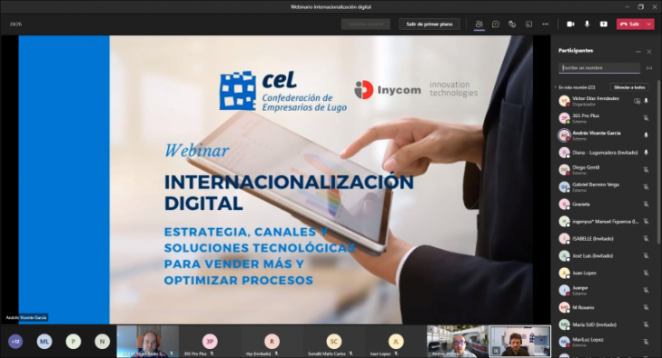 Máis dunha vintena de empresarios de Lugo participaron onte no webinario "Internacionalización dixital: estratexia, canles e solucións tecnolóxicas para vender máis e axilizar procesos", convocado pola CEL para informar sobre as opcións de venda por Internet, acceso a novos mercados e a convocatoria 2021 das axudas autonómicas do programa Galicia Exporta Dixital, de Igape e Xunta de Galicia.